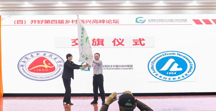 会上,湖南商务职业技术学院与我院进行交旗仪式。2021年第四届全国职业院校乡村振兴协作联盟高峰论坛将在我院举办。