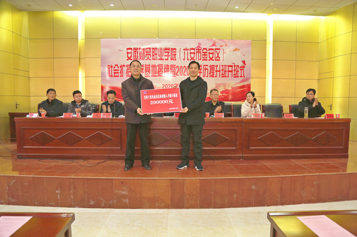 在仪式上,刘银国和黄媛媛共同为学院(六安市金安区)社会扩招教学基地揭牌,何翔代表学院向孙岗镇捐赠人才振兴基金20万元。