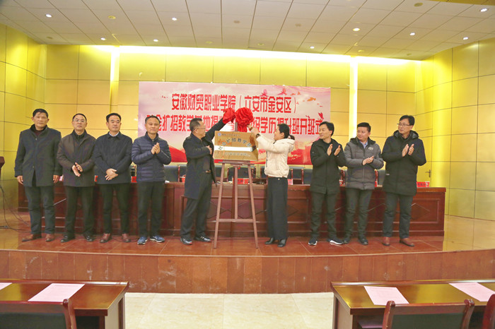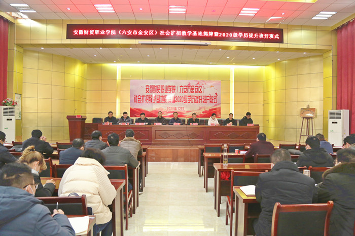 12月25日上午,安徽财贸职业学院(六安市金安区)社会扩招教学基地揭牌暨2020级学历提升班开班仪式在六安市金安区孙岗高级职业中学举行,学院党委书记张志祥,党委副书记、院长刘银国,党委副书记、纪委书记何翔,金安区委常委、组织部部长黄媛媛出席仪式。学院相关部门主要负责人,孙岗镇领导班子成员,学院(六安市金安区)2020级社会扩招班全体学员参加仪式。六安市金安区区委副书记、区长霍绍斌会见了学院领导一行,并就有关校地合作事项开展了商谈。