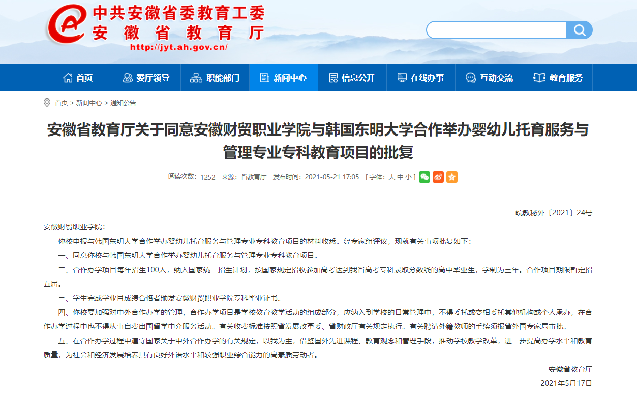 近日,安徽省教育厅发文,同意我院与韩国东明大学合作举办婴幼儿托育服务与管理专业专科教育项目。这也是我校获批的第6个中外合作办学项目。