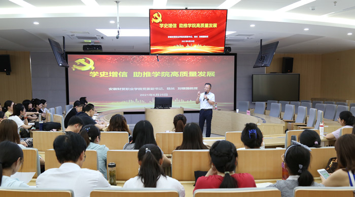 为深入推进党史学习教育,6月25日下午,学校党委副书记、校长刘银国在A502实训室,为教务处党支部、财会金融学院党总支和公共教学部学生党支部的全体党员同志作《学史增信,助推学院高质量发展》专题党课。