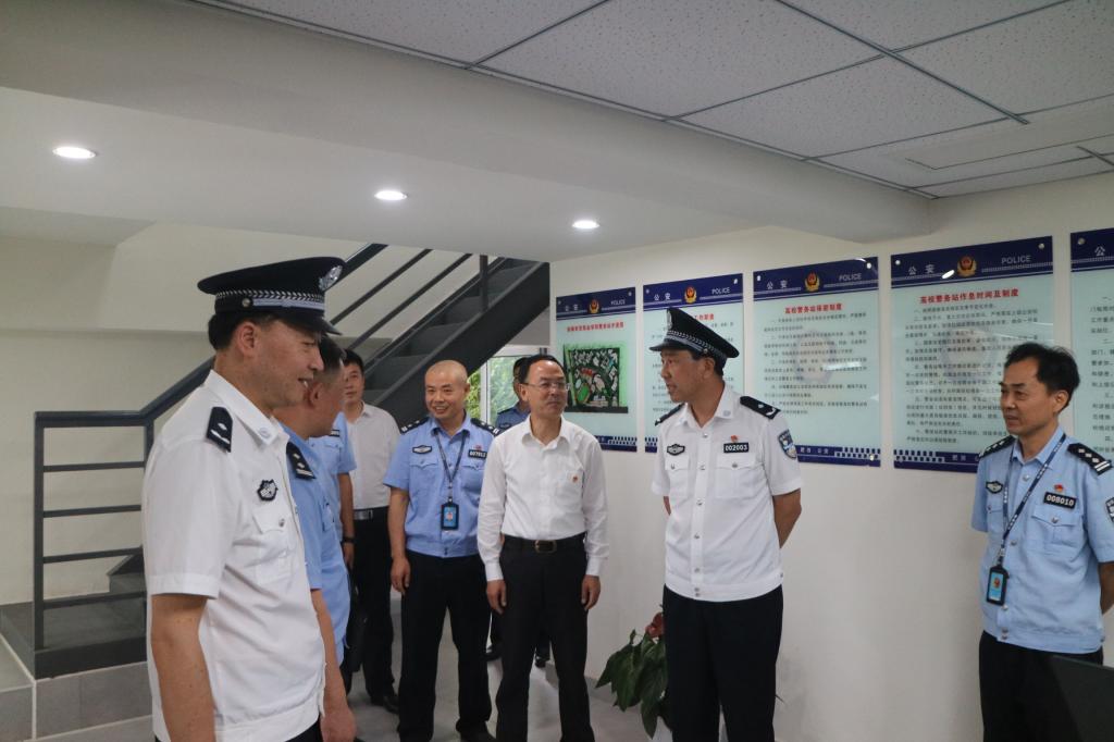 6月29日上午,合肥市公安局党委委员、副局长杨援军一行来校检查调研高校综合警务站规范化建设情况以及校园安保工作。学校党委副书记、纪委书记何翔以及肥西县公安局副局长孟平、县国保大队张海峰、桃花派出所负责人、学校总务处负责同志陪同调研。
