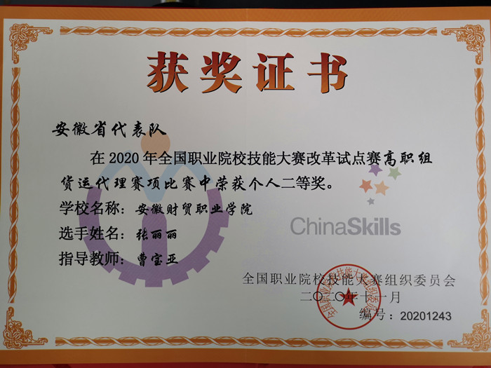 11月16日至18日,2020年全国职业院校技能大赛改革试点赛(高职组)货运代理赛项在山东潍坊举办。安徽省代表队由我院曹宝亚担任指导老师,选手商英1801班张丽丽最终以总分第四的好成绩获得国赛二等奖。