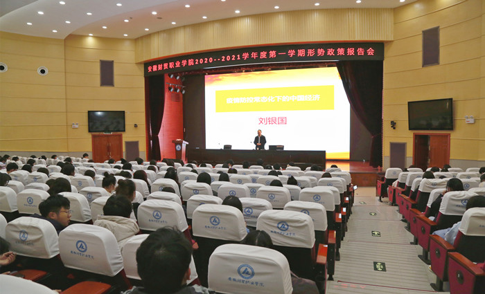 12月2日晚,学院党委副书记、院长刘银国在学术报告厅作了题为《疫情防控常态化下的中国经济》形势政策报告会,财会金融学院、公共教学部近200名学生代表参加报告会。