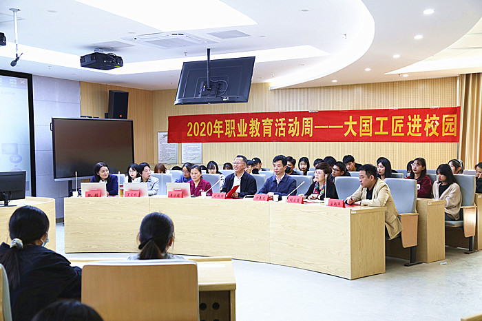 为贯彻落实《国家职业教育改革实施方案》,大力弘扬劳动光荣、技能宝贵、创造伟大的时代风尚,2020年职业教育活动周在学院开展。财会金融学院邀请李小莉、丁宏锁、张莉三位来自生产科研一线的大国工匠、全国人大代表,为学生举办“大国工匠进校园”讲座,校长刘银国出席并致辞,财会金融学院负责人、专职辅导员以及学生代表聆听了讲座。
