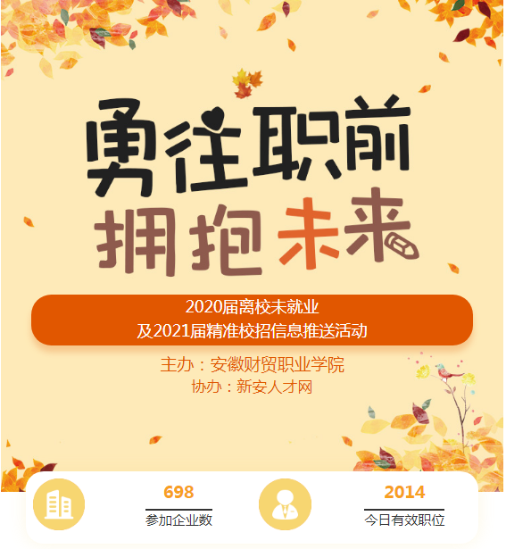 为进一步做好疫情常态化期间2020届离校未就业毕业生就业工作及2021届学生的就业实习工作,自9月2日起,学校与新安人才网平台合作举办了线上双选精准分类招聘会。本次校园招聘会精选698家用人单位参与,提供有效岗位2014个,关注人次3638次,共投递出1592份简历,目前招聘会正在火热进行中。