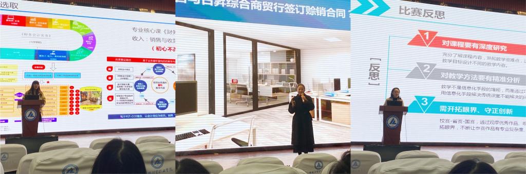交流会上,王飞洋以与时俱进谋创新为主题,详细阐述了其教学设计思路;张璐以客户信用管理一章为例,进行了精彩的无生授课展示;卫欣怡结合2021年大赛感悟和赛后反思与大家分享了该团队备赛的心路历程。同时,王潇结合“基于新业态和新标准”章节展示了其现代信息教学技术与传统教学相结合的教学设计;汪洋以 “听觉训练方案实施”为主题进行无生授课,让在场的老师们感受到了教学创新带来的听觉冲击。五位青年教师从教学目标、内容导入与分析、问题解决与总结等环节展开,毫无保留地与大家分享了备赛的经验,也充分展现了安财院教师教学风采。