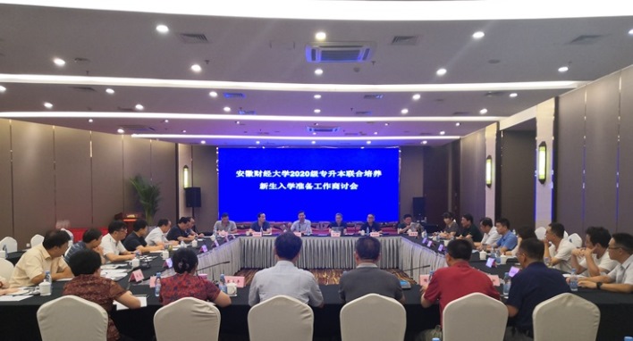 8月8日,安徽财经大学、安徽财贸职业学院、安徽工商职业学院、安徽审计职业学院等四校2020级联合培养专升本新生入学准备工作商讨会在合肥召开。安徽财经大学党政办、教务处、学生处、财务处和招生就业处主要负责同志,安徽财贸职业学院、安徽工商职业学院、安徽审计职业学院党政主要负责人以及相关处室负责人参加会议。会议由安徽财贸职业学院承办。