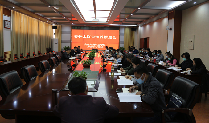 4月8日上午,为积极统筹做好我校与安徽财经大学联合招生培养专升本应用型人才工作,学校在行政楼第四会议室召开专升本联合培养工作推进会。校长刘银国主持会议,校党委书记张志祥、副校长胡戴新出席会议,应用型本科人才培养试点工作领导小组成员参加会议。