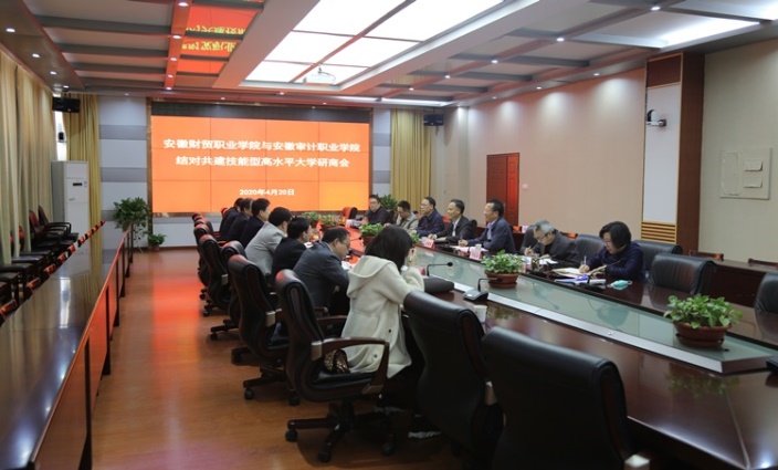 近日,安徽审计职业学院党委书记范新国,党委副书记、院长胡孝东一行来我院研商技能型高水平大学结对共建工作。我院党委书记张志祥,党委副书记、院长刘银国,相关部门、院系负责人参加了会议。