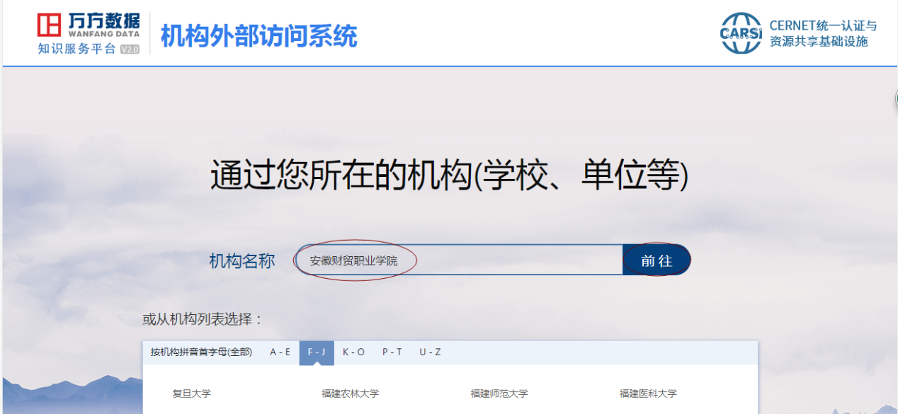 附:校外(校内访问不需要认证)通过CARSI访问“万方数据”和“中国知网”操作说明: