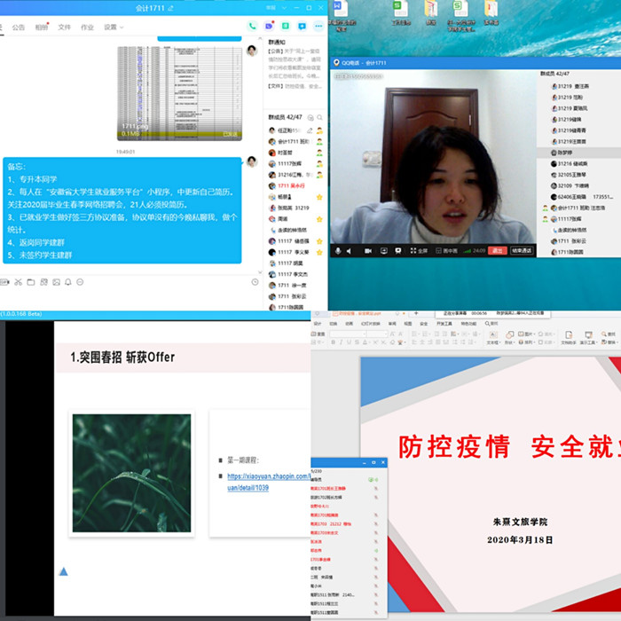 通过线上主题班会,92个毕业班辅导员介绍了目前国家就业的形势、相关的就业政策和学校就业工作的相关要求,动员毕业生转变就业方式与思路,积极参与我校2020届毕业生春季网络招聘会,并就毕业生关心的简历维护、求职信息获取、岗位选择等具体问题进行集中指导。要求毕业生把握好当前就业的黄金期,主动与用人单位沟通联系,认识企业,主动就业。同时,鼓励准备专升本的同学用心准备、精心复习、耐心等待;鼓励有担当、有抱负、有理想的毕业生到基层去,到西部去;并提醒有意向就业的毕业生就业签约时,谨防收费陷阱,试用期陷阱、推荐信陷阱、“高薪”岗位陷阱等形式的招聘陷阱等。