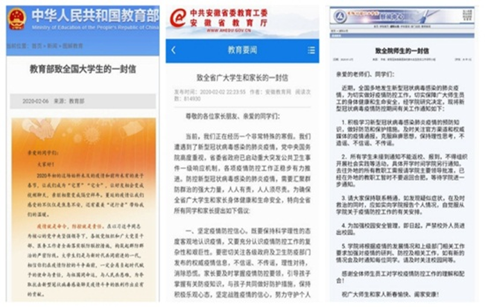 加强正面宣传引导。按照上级和学校防控工作领导小组的通知要求,通过校园网、安财学生管理QQ群、安财辅导员微信群、今日校园等形式,学生处、各院部及时转发《教育部致全国大学生的一封信》、《省教育厅致全省广大学生和家长的一封信》、《学校致全院师生的一封信》等,将《关于寒假期间学生不要提前返校的通知》发至各班级QQ群、微信群,通知每位学生延迟开学、所有学生不得提前返校,提醒学生要遵守当地政府疫情管控规定,做好疫情防护工作。引导学生关注国家卫健委、安徽省卫健委等官方平台公布的疫情信息,提高学生对疫情的认识,做到不造谣、不信谣、不传谣,用实际行动维护大局、服从大局,弘扬青春正能量。