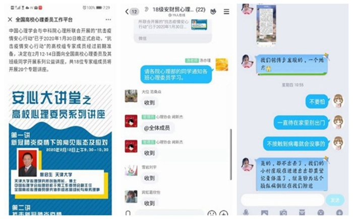 开通网络心理服务。根据国家卫健委1月26日印发的《新型冠状病毒感染的肺炎疫情紧急心理危机干预指导原则》,为积极应对新冠肺炎疫情,学校启动疫情防控期间心理干预系统,加强心理疏导、做好人文关怀,印发《关于疫情防控期间开通师生心理支持热线和网络辅导服务的通知》,自2月1日起至开学,心理健康教育中心面向全校师生开通心理支持热线和网络辅导服务,组建心理援助服务团队,每天有3名专业心理咨询师为全校师生提供及时专业的心理咨询服务。截至日前,心理援助服务团队接到近40名学生的咨询和求助,主要通过网络心理辅导、邮件心理辅导、心理支持热线等服务方式,进行温暖有爱的共情理解、耐心细致的心灵抚慰和科学专业的心理疏导,舒缓因疫情带来的不良情绪。普及特殊时期心理健康知识,组织学生在线收看《抗击疫情安心行动》,面向全国广大学生20场系列公益讲座,引导学生以平和冷静的心态应对疫情,增强学生战“疫”的必胜信心,让健康心态成为预防疫情的“心理口罩”。