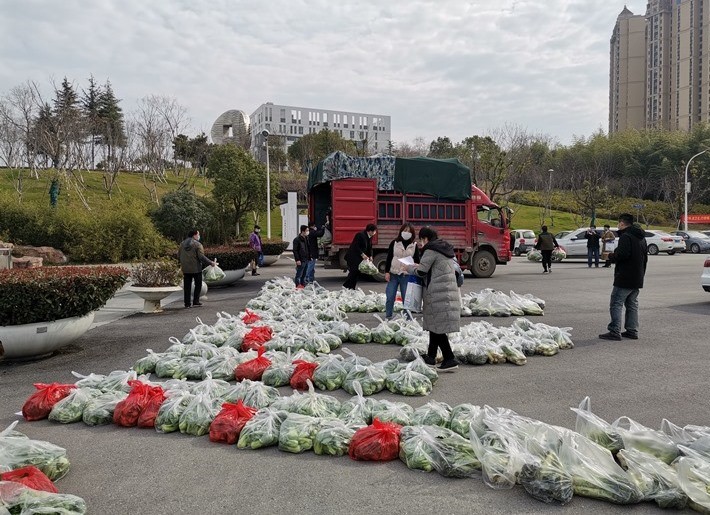 2月24日,学院教职工订购的1125斤青菜和1095斤莴笋经专车运送至校园内,因处于特殊时期,学院不组织全员来校领取,而是按照部门分组发放,各部门组织派送,避免人员集中。