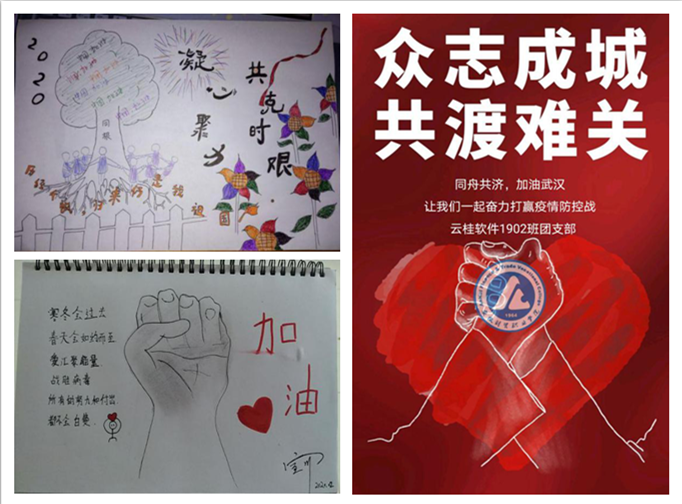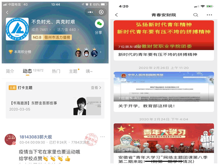 教育引导有深度。在做好疫情防控宣传的同时,学校各级团组织适时通过网络新媒体面向广大青年学生深入开展国情、省情和形势政策教育,积极宣传新时代青年精神。在防控期间,校团委第一时间发出了《为武汉加油-微祝福》活动,号召我校全体青年学生为中国加油,为武汉加油,第一天就收到祝福信息1048条。此外,为全面贯彻停课不停学号召,团委通过微信公众号每日推送经典阅读、艺术赏析、室内锻炼、专业学习等打卡主题,引领同学们培养健康生活风尚,截止目前,参与打卡人数达7461人,共打卡131667人次。随着防控工作的全面展开,各级团组织积极开展了“凝心聚力 共克时艰”防疫宣传作品征集活动,教育引导每位安财院青年学子坚定科学防控战胜疫情的信心,积极主动承担起同心战“疫”的责任与担当,共收到来自各院部短视频、手工绘图、宣传文稿、图片等作品70余件。