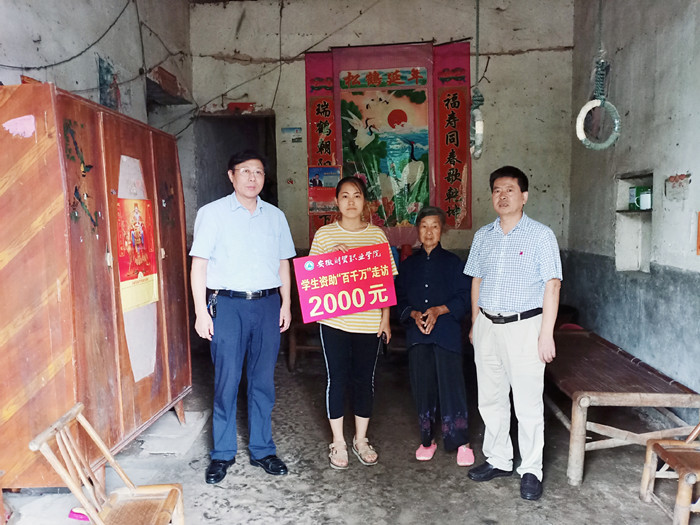 为宣传贯彻学生资助政策,全力做好教育扶贫资助工作,健全资助育人服务体系,落实打赢脱贫攻坚战的决策部署,学校对2019年暑期学生资助“百千万”走访活动作出部署,由全体校领导带队赴一些贫困县区走访慰问特困学生家庭。7月9日,副校长胡戴新率领学生资助“百千万”走访第四组成员,前往枞阳县走访慰问建档立卡和经济困难学生家庭,并送去慰问金。雪岩贸易学院党总支和朱熹文旅学院党总支负责同志随行。