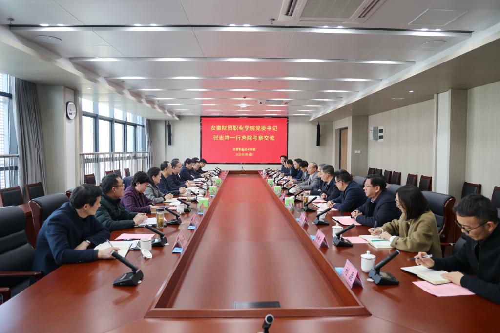 3月6日下午,学校领导张志祥、刘银国、何翔、胡戴新、罗虹前往安徽职业技术学院考察学习。安徽职业技术学院领导李方泽、盛鹏、张智清、杨林国、李荣富热情接待。双方学校相关部门负责人员陪同调研。
