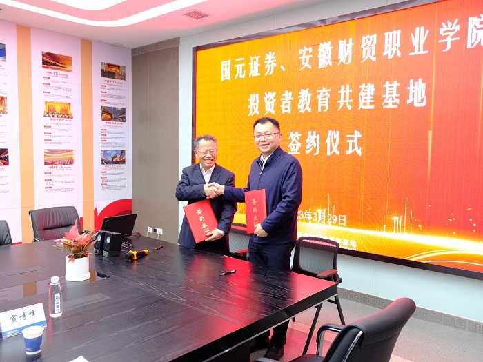3月29日下午,学校与国元证券股份有限公司校企合作暨投资者教育共建基地签约仪式在国元证券投资者教育基地举行,学校党委副书记、校长刘银国,国元证券股份有限公司党委委员、副总裁范圣兵出席签约仪式。国元证券总裁助理兼合肥分公司总经理张俊、国元证券投资者教育基地负责人、财会金融学院相关人员参加签约活动。