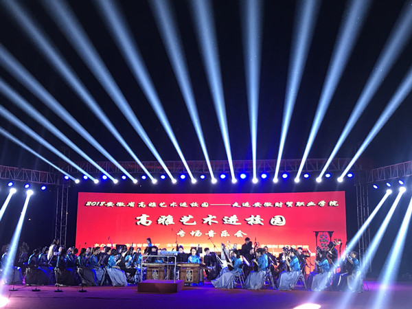 10月14日晚,安徽省2018年“高雅艺术进校园”安徽师范大学民族管弦乐团走进安徽财贸职业学院专场音乐会在学校圆形剧场隆重上演。校长刘银国,校长助理吴晓光、徐峰,安徽师范大学音乐学院党委书记王景旭、党委副书记奚泰来与我校2000多名师生一同感受了此次音乐会的盛况。