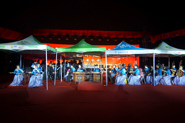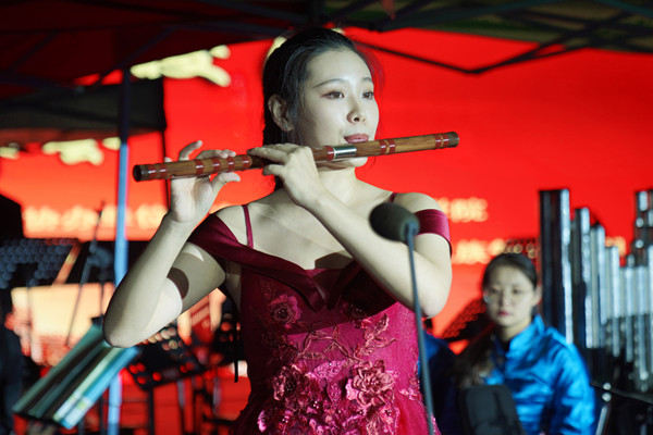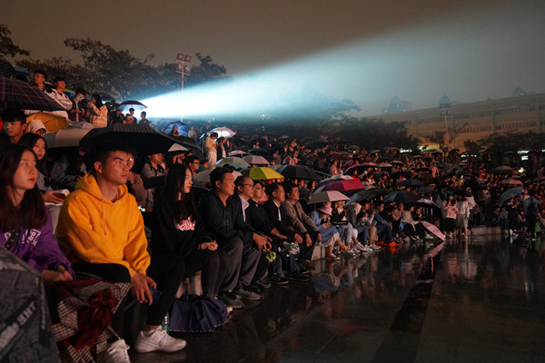 晚上6点30分,华灯初上,音乐会在一曲节奏欢快的竹笛独奏《姑苏行》中开启,在悠扬顿挫、热情欢快的节奏中,让现场观众感受到民族文化的魅力。随后,一首女生独唱《唱支山歌给党听》表达了对改革开放40周年的美好祝愿。在音乐家们的倾情演绎下,乐曲或忧郁伤感,或明快抒情,或气势磅礴,或低缓悠长,现场观众无不被艺术家们的精彩表演所折服,台下报以热烈的掌声。正当现场观众陶醉在美妙的音符中时,天空突遇降雨,大型演出活动无法进行,但现场观众依旧坚持在现场等待,安徽师范大学民族管弦乐团被同学们的热情所感动,决定现场重新编排曲目,在雨中搭起临时帐篷,为同学们表演了二胡二重奏《赛马》、男生独唱《跟你走》、琵琶独奏《霸王卸甲 》,女生独唱《洗菜心》、古筝独奏《战台风》,女生独唱《西厢听》 等节目,为同学们奉献了一场别有风味的视听盛宴。现场欢呼声、喝彩声不绝于耳,深深的被民族管弦乐的无穷魅力所吸引,同时又被安徽师范大学民族管弦乐团饱满昂扬的风貌、尽职尽责的态度、无私奉献的精神所感染。