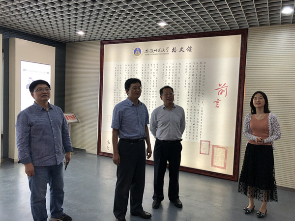 会后,刘银国一行还先后前往安徽商贸职业技术学院、安徽师范大学学习交流,受到了安徽商贸职业技术学院校长李忠、副校长郑承志和安徽师范大学校长张庆亮、副校长彭凤莲等领导的热情接待。在安徽商贸职业技术学院,刘银国一行听取了该校在地方技能型高水平大学建设、全国优质校建设、教科研管理、师资队伍建设、高层次人才引进等方面的经验介绍;在安徽师范大学,刘银国与张庆亮、彭凤莲等校领导就校园建设、专业建设、校园文化建设、师资队伍建设、后勤保障等方面展开了充分交流和沟通,并饶有兴致地参观了安徽师范大学校园和安徽师范大学校史馆。刘银国表示,到两所兄弟院校学习交流,开阔了视野,畅通了思路,借鉴了经验,很有收获,很有启发,他要求相关职能部门虚心学习,解放思想,脚踏实地,真抓实干,学有所用,有所作为。
