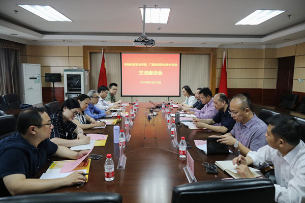 在广西经贸职业技术学院,党委副书记杜远阳介绍了该校办学的基本情况、办学规模、办学思想、标志性教学成果等,教务科研处副处长程波介绍了内部质量保障体系建设的基本情况、诊改工作中发现的问题及下一步工作打算。双方还就校园建设、组织人事、办公室、教学管理、后勤等工作进行对口交流和探讨。座谈会后,考察组一行参观了服装与服饰设计专业实训室、市场营销专业实训室、烹饪工艺与营养专业实训室和职业教育活动周校园展销会。