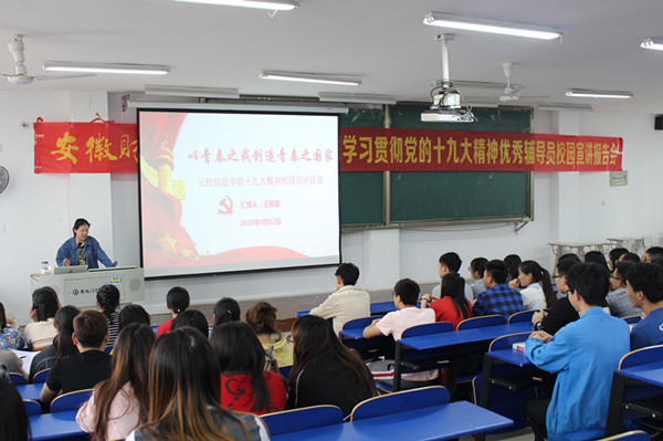 4月12日,学校第二期学习贯彻党的十九大精神优秀辅导员校园宣讲第六场报告会在6103教室举行。云桂信息学院优秀辅导员代表王晓露担任主讲。云桂信息学院2016级200多名同学参加了宣讲会。