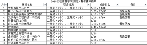 在刚刚落幕的2018年安徽省职业院校技能大赛上,云桂信息学院参赛师生不畏强手,勇于拼搏,创造了6金6银6铜的历史最好成绩,所有参赛项目均获奖,并有5项晋级国赛。