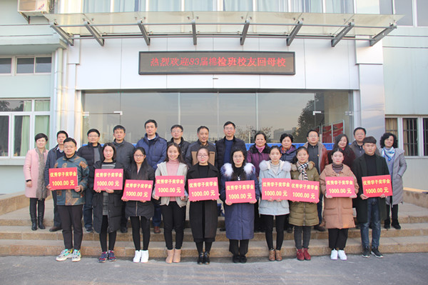 罗虹代表学校领导向设立此奖项的83届棉检班校友致以崇高的敬意和衷心的感谢。她指出,在2014年庆祝建校50周年华诞时,83届棉检班校友为回馈母校栽培,面向家庭困难、品学兼优的学生捐资设立了优秀学子校友奖学金,三年来共有30名优秀学子获得殊荣,资助奖学金3万元。同时学校认真贯彻落实学生资助政策,不断完善多元化的学生资助体系,创新性实施了“助困倍增计划”,汇聚社会各界的爱心力量,确保每一名同学不因家庭困难而失学。