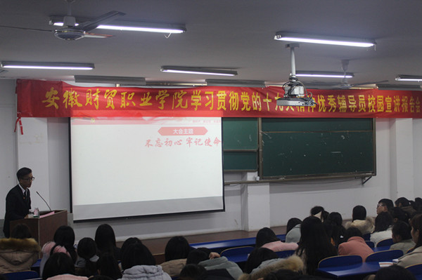 12月26日晚,由校学生处主办、大位会计学院承办的“学习宣传贯彻党的十九大精神优秀辅导员校园宣讲报告会”第二场在6103教室举行。大位会计学院学生代表200余人参加报告会,会议由大位会计学院党总支副书记张少兵主持。