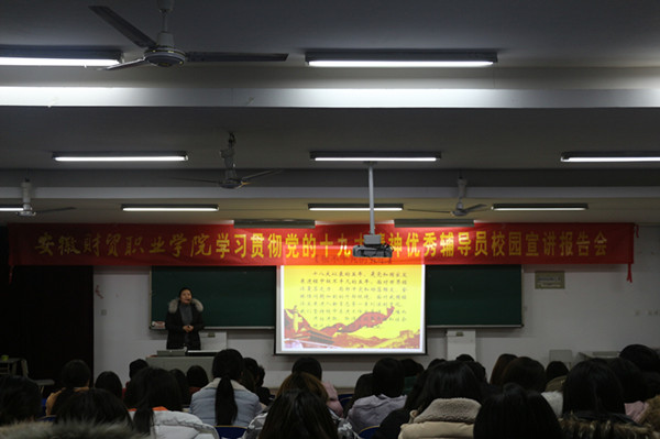 12月28日晚,由学校学生处主办、行知管理学院承办的“学习宣传贯彻党的十九大精神优秀辅导员校园宣讲报告会”第六场在6102教室举行。行知管理学院200余名学生干部参加报告会,会议由行知管理学院党总支副书记唐学华主持,行知管理学院优秀辅导员代表左艳琼主讲。