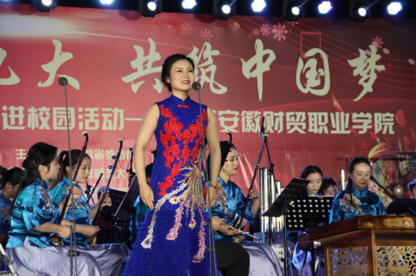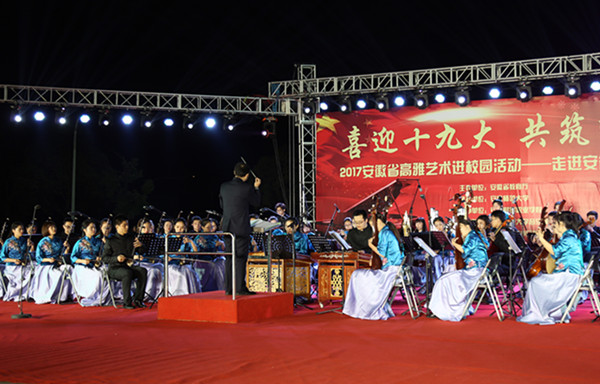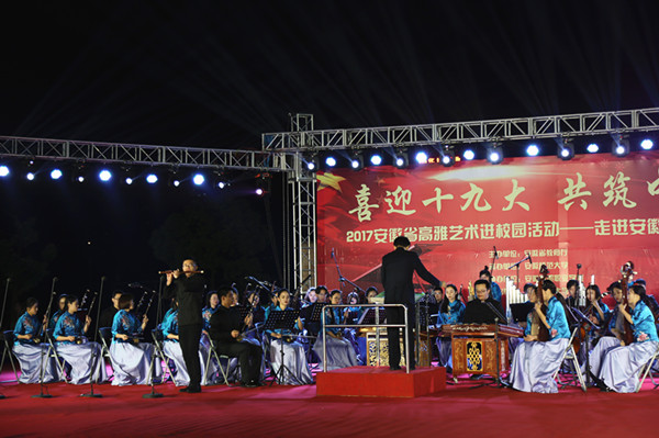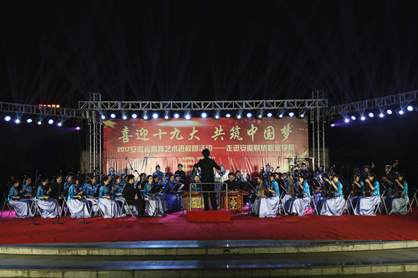 10月18日晚,安徽省2017年高雅艺术进校园活动安徽财贸职业学院专场音乐会在学校露天剧场举办,在党的十九大胜利召开的当天,安徽师范大学音乐学院民族管弦乐团在“喜迎党的十九大 共筑中国梦”的浓郁氛围中,为学校师生贡献了一场民族的、高雅的音乐盛宴。学校校长刘银国,安徽师范大学音乐学院党委书记王景旭、副院长汪健萍与学院2000多名师生一起欣赏了音乐会。