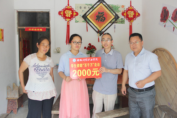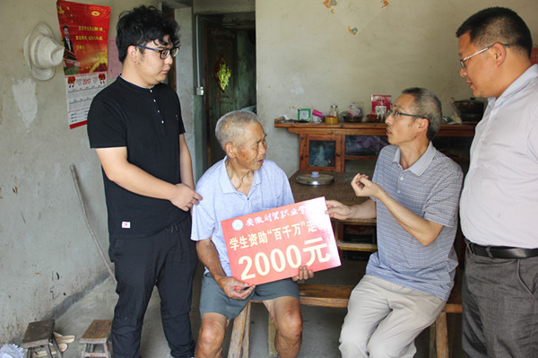 7月11日,学院院长助理邓庆安率学生资助“百千万”走访第七组成员,前往庐江县白湖镇杭头村、沙溪乡泉溪村实地走访了贫困学生家庭,并送去了慰问金。宾虹艺术学院党总支副书记张伟、学生处武军随行。