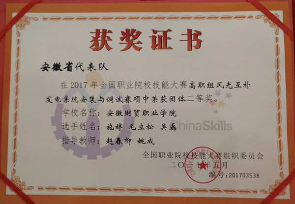 5月26-28日,2017年全国职业院校技能大赛高职组“风光互补发电系统安装与调试”赛项在安徽机电职业技术学院举行。全国28个省市(自治区)的74支代表队共222名选手同台竞技、切磋技能。云桂信息学院代表安徽省参加了比赛,经过9个小时艰苦的封闭比赛和裁判现场测试评分,最终名列第10,获得二等奖。