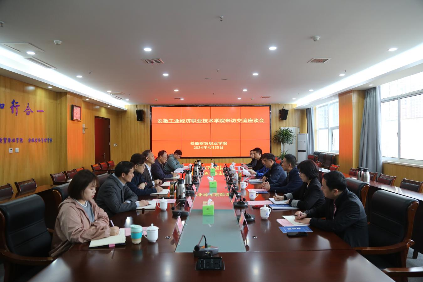 4月30日上午,安徽工业经济职业技术学院党委书记许卫一行来我校调研考察公开招聘、高层次人才引进和职称评审等方面工作,学校党委书记张志祥,党委副书记、副校长何翔,人事处等相关部门人员参加座谈交流。