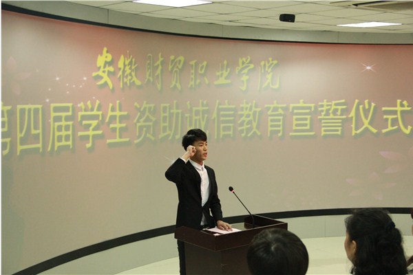 宣誓仪式上,学院学生会副主席、国家励志奖学金获得者经纪1501班魏德龙同学带领参会的全体学生庄严宣誓:热爱祖国,遵纪守法,明德修身;恪守信用,履行责任,知荣明辱;勤俭节约,艰苦奋斗,热心公益;诚实做人,诚信做事,言行一致;勤奋学习,自强不息,励志成才,在今后的学习工作生活中,传承中华美德,弘扬徽商精神,常怀感恩之心,真诚回报社会,为母校增光添彩,努力成为一名合格的社会主义事业的建设者和接班人。会后,同学们踊跃参加诚信教育大型签名活动。
