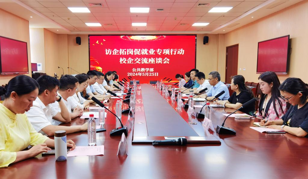 5月25日,学校党委委员、副校长王海龙在学校翡翠校区参加公共教学部访企拓岗促就业专项行动校企交流座谈会。公共教学部相关负责人以及来自省内外14家企事业单位的负责人等参加了此次会议。