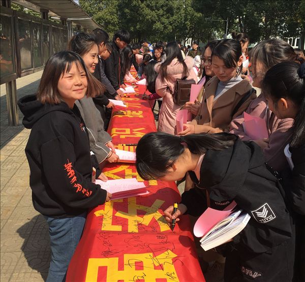 学院第十个安全卫生月于3月1日正式启动,当天中午,由学生处(团委)举办的大型签名活动在在西教学楼宣传栏前举行,过往同学纷纷在印有“增强安全意识,提升财贸素养,优化育人环境,构建和谐校园”的横幅上签名留言,许下自己共建美好校园的诺言。