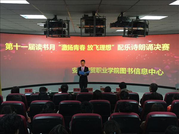 11月22日中午,学院第十一届读书月系列活动“激扬青春 放飞理想”主题诗歌朗诵比赛在3D实训室举行。学生处处长薛卫敏,国际交流中心主任邵会如,教务处副处长王海龙,团委副书记朱枚林,基础部副主任张少兵,图书信息中心主任张克主任、副主任丁联应邀担任比赛评委。