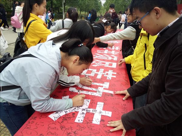 读书协会的会员们带头签名,表示书籍是人类进步的阶梯,作为学生更应该徜徉在书籍的海洋中,通过读书明志、通过读书励志,共同营造书香校园的良好氛围。