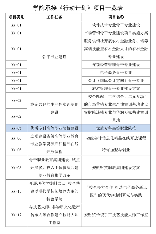 《高等职业教育创新发展行动计划(2015—2018年)》是今后一个时期我国高等职业教育战线贯彻2014年全国职业教育工作会议精神和落实全国人大常委会职业教育法执法检查有关要求,深入推进改革发展的路线图,其中明确的任务和项目是高等职业教育改革发展的工作载体。在此次公布的我省承接《行动计划》任务和项目单位名录中,学院获批承接优质专科高等职业院校建设等11类任务和15个项目,彰显了学院在人才培养、科学研究、社会服务、文化传承与创新等方面的综合实力和办学水平。