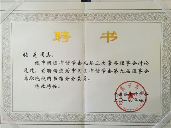 5月20日,全国职业院校图书馆服务创新论坛(2016)暨中国图书馆学会高职院校图书馆分会成立大会在京举行。我院图书信息中心主任张克被聘为中国图书馆学会第九届理事会高职院校图书馆分会委员和学术研究专业委员会委员。