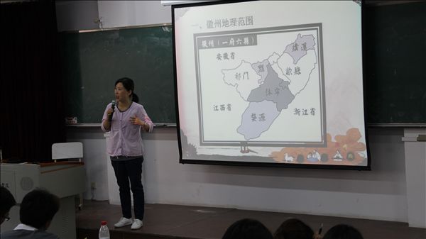 讲座中,胡芳从徽州所处的地理位置分析了徽州聚落的产生和发展的原因,以及受此地理环境影响而形成的文化特色。徽州聚落文化以物质形式和外在体现主要反映在徽派建筑中,水口、村口、主街或水街、巷道或水巷、宅居、祠堂(祠堂群、中心小广场)、牌坊、书院、戏楼、桥亭、绣楼、更楼、族民,这些各种各样的建筑共同构成了属于徽州人的建筑文化和聚落特色,也透过这些建筑将徽州厚重的历史和丰富的文化内涵流传和展示给后人。