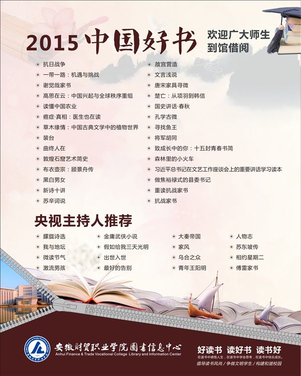 今年世界读书日,“2015中国好书”盛典在央视一套播出,共有28种图书入选“2015中国好书”,包括主题出版、人文社科、文学艺术、科普生活、少儿五大类别和4种年度荣誉图书。目前,学院师生可以在我院图书信息中心借阅到上述图书。