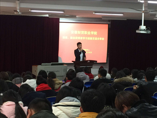 会上,会电1407班的於雯琪用自己的经历告诉大家要确定明确的目标并保持积极向上的态度,注重积累的重要性,要认真听好每一节课,重视学习的同时还要积极参与各种有益的业余活动。国际商务2014级李艳廷同学用自己暑假工和参加安徽省大学生营销技能挑战赛的经历告诉大家,有毅力学会坚持,才会成功。连锁1404班的张何同学告诉大家贫寒是一种苦难也是种财富,是颓废还是奋斗,完全把握在自己手中。财税金融系农金1402班的田慧同学以自己为例总结,表示要树立正确的目标,调整自己的心态;要做好职业生涯规划;要培养自己的兴趣爱好和竞争意识;要分利用校园里一切可以利用的资源。旅游1301班的陈白雪用“我的心中有座山”作为主题,告诉大家把时间花在刀刃上,学会积累和沉淀。计算机应用1301班徐文龙同学分享了自己由班级倒数变为每学期综合成绩都名列第一的宝贵经验——设定目标,科学规划的重要性。会展1401班的周丽同学坚信“幸运喜欢垂青于那些执著并勇敢的人”,她鼓励大家脚踏实地,努力奋斗。