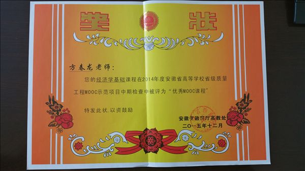 12月16 日下午,安徽省高校数字图书馆建设成就展暨安徽省网络课程学习中心平台开通仪式在中国科学技术大学举行。省教育厅公布了2014年度立项的安徽省省级质量工程首批MOOC示范项目的中期检查结果。学院行知管理学院方春龙老师的《经济学基础》和胡芳老师的《管理学基础》在检查中获得优秀等次。