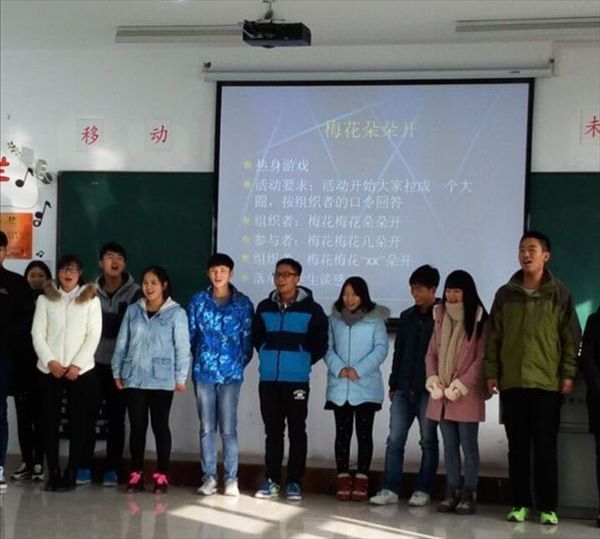 两位老师通过“大风吹小风吹”、“心有千千结”、“梅花朵朵开”等游戏项目让每个同学之间很快熟悉起来,同学们感受团体中个人努力的重要性及个人力量积聚后团队能力的巨大,共同体验合作带来的快乐,在游戏中达到心态调整的效果。
