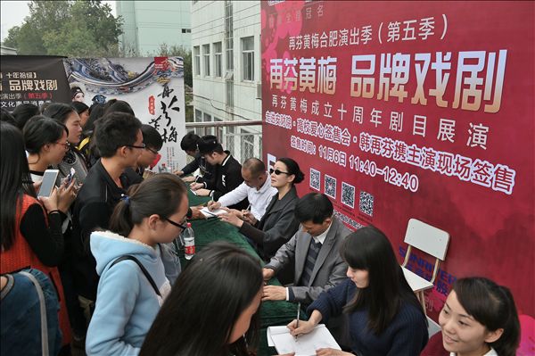 得知韩再芬老师会亲临爱心票签售现场,喜爱黄梅戏和韩再芬老师的同学们早早就在现场排起了长队等待。韩再芬老师对同学们的热情表示感动,在签售的同时与同学们交流传统文化和传统戏剧,鼓励同学们走进高雅艺术,提升气质修养,做一个宣传安徽、宣传黄梅戏的人。