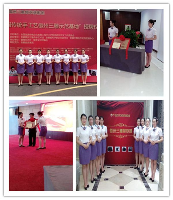 6月10日,“中国传统手工艺徽州三雕示范基地”授牌仪式在安徽饭店举行。我院礼仪队8名队员担任大会礼仪服务工作,受到主办方一致好评。
